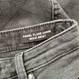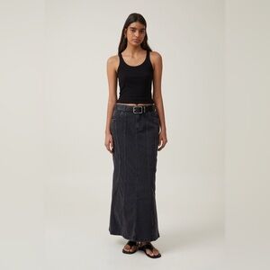 Cotton On black denim maxi skirt in excellent pre-owned condition. Features a sleek, minimal silhouette with vertical seam detailing and a flattering high-rise fit. Super versatile — easy to dress up or down year-round.