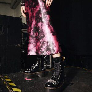 Tall got tougher. Built on our highest ever sole: the 2 1/4 inch Quad Retro Max. Constructed from high shine durable Patent Lamper surrounded with hardware chains. Everything on this boot is turned up to the max with oversized eyelets. Finished with our unmistakable yellow Goodyear welt and AirWair heel loop.
