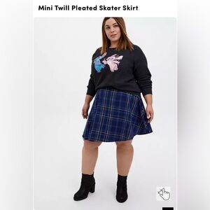 Cute + classic mini skater skirt from Torrid in a navy plaid. Pleated twill fabric, zip back, and elastic panel for comfort. Perfect for fall outfits with tights and boots or year-round styling.