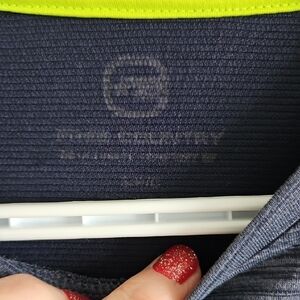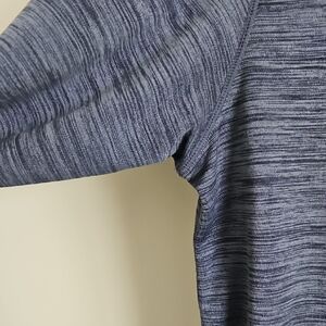 Stay comfortable and stylish with this blue long sleeve shirt. Perfect for any casual occasion. Has zipper pocket on the side. Tag says small but could fit a medium. Refer to measurements in photos. In good condition with wear on the words.