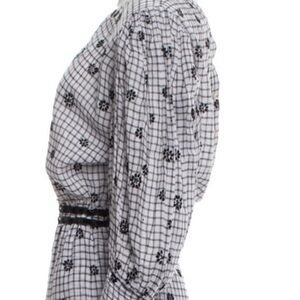 Romantic LoveShackFancy mini dress featuring a black & ivory gingham check with delicate floral print throughout. Flowy tiered ruffle skirt, soft puff sleeves, and a cinched waist with contrasting belt detail for a flattering silhouette. Lightweight and feminine — perfect for brunch, garden parties, vacations, or spring/summer events.