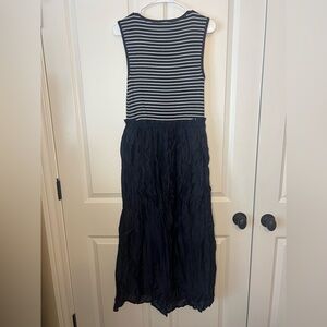 Stylish striped tank top paired with a flowing navy maxi skirt. Perfect for casual outings.