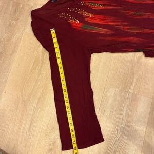 Chic Rust Red tunic with detailed beaded pattern. Features long sleeves and a stylish V-neck. Whimsygoth