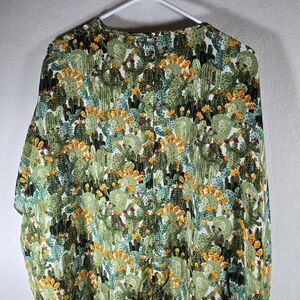 The Berry N Cream Shaw is a vintage-inspired women's blouse in size XL with a unique cactus design and floral pattern. This ivory tunic features 3/4 bell sleeves and a relaxed fit, making it a comfortable and stylish choice for any occasion. The pleated accents add a touch of elegance to this 90s-themed top, perfect for adding a statement piece to your wardrobe. Made from polyester, this blouse with a round neck and adjustable features is a must-have for any fashion-forward woman looking to make a statement.