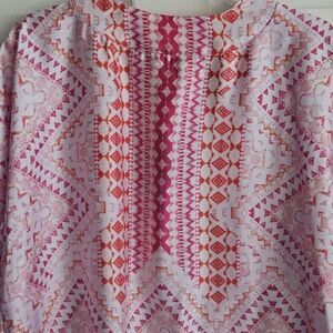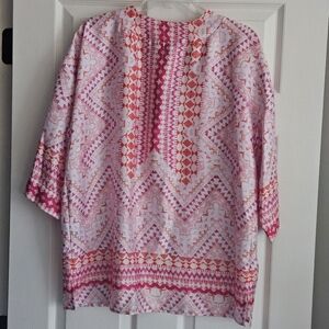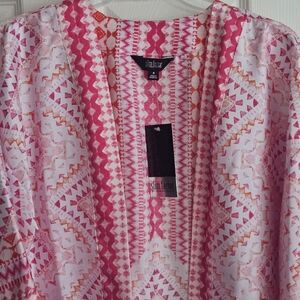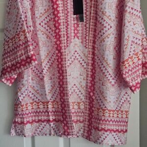 Investments 3/4 Sleeve Open Front Kimono: Magenta/White/Orange Mosaic Tile Print