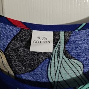 Details: Sleeveless scoop neckline, bold tulip print, striped hem detail, lightweight cotton, flowy silhouette