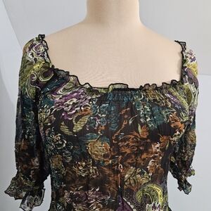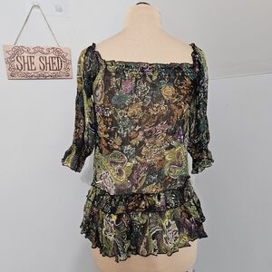 Y2K Paisley Mesh Peasant Top Whimsigoth Sheer XS Coquette Fairy Goth Artsy Boho