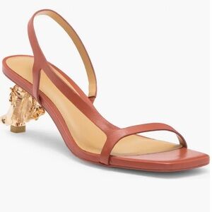 Elegant terracotta heels with unique gold heel design. Perfect for stylish occasions.