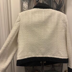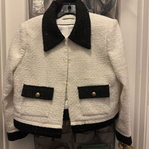 Elegant tweed jacket with contrasting black collar and pockets. Features gold button accents.
