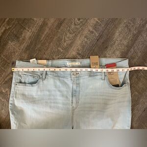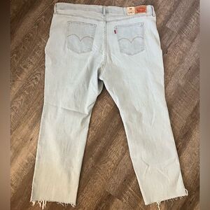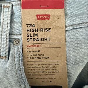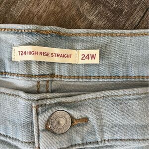 This listing is for a NWT's Levi's Plus Size 724 High Rise Slim Straight Jean in light blue, open hem, size 24W. High rise. Slim fit. Straight leg. We took your favorite high rise and updated it with an ultra-modern straight leg. Part of our signature ‘Lot 700’ fits, our 724 High-Rise Straight Jeans are designed to flatter, hold and lift—all day, every day.
