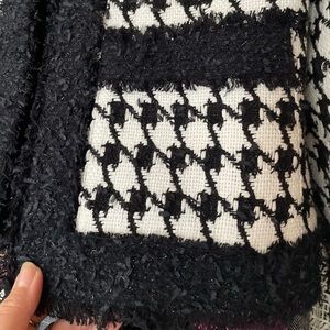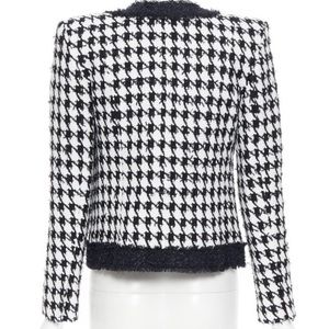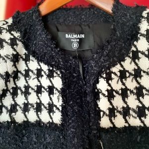 Balmain's black and white houndstooth jacket showcases the label’s rich heritage through a vintage-inspired silhouette.