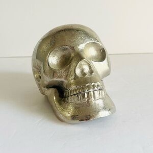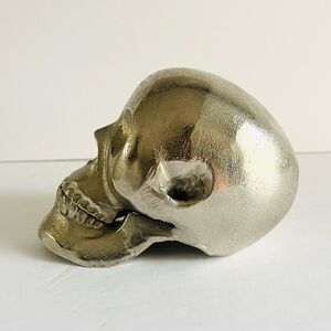 Metallic skull sculpture by Torre & Tagus, made in India. Crafted from solid cast aluminum with a textured silver finish.