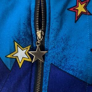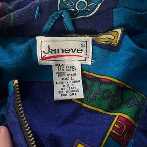 Vintage Janeve quilted and lined bomber jacket likely from the late 1980s or early 1990s. It features a distinctive and colorful abstract or geometric art print with elements like stars and various shapes. Star zipper.