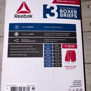 Reebok Men's 3-Pack Performance Boxer Briefs with Fly Pouch. Brand New in Box. Size Small (28-30). Cool & dry, anti-odor, stretch performance. Secure leg fit that won't ride up. Contour flap out for added support. Soft performance fabric for comfort and fit authentic Reebok logos pouch 100% polyester. 4092% polyester and 8% spandex. Machine washable.