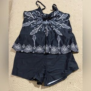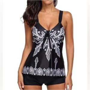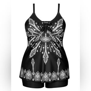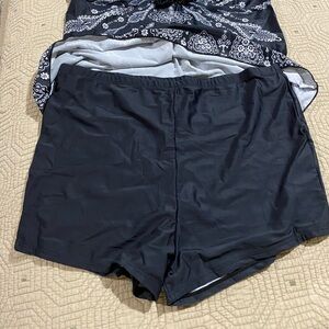 This Retro paisley print tankini swimsuit with swim shorts in black size 3XL is a stylish and comfortable two-piece swimwear option for plus-sized women. The tankini features a spaghetti strap top with removable pads and adjustable straps, while the swim shorts offer a flattering and practical bottom style. Made of polyester and spandex, this retro-themed tankini is perfect for adding a touch of vintage flair to your pool or beach look.