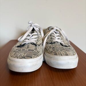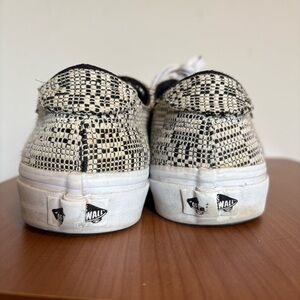 These classic Vans fashion sneakers are a black and cream woven pattern with a white bottom.