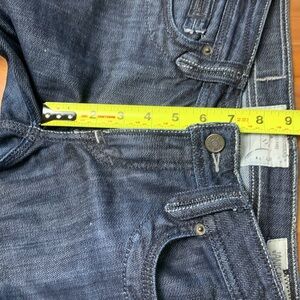 The denim is fairly lightweight with just a bit of stretch. Inseam is 33 1/4 inches.