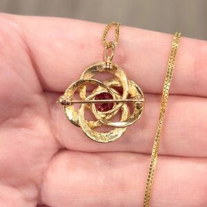 Gorgeous vintage style clover Celtic circle shaped gemstone Brooch/Pendant! Featuring a deep hot pink colored natural 8.5mm round cut Tourmaline, set in 14K solid yellow gold.