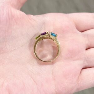10K Rainbow amethyst Swiss blue topaz peridot trillion harem yellow gold CI ring
