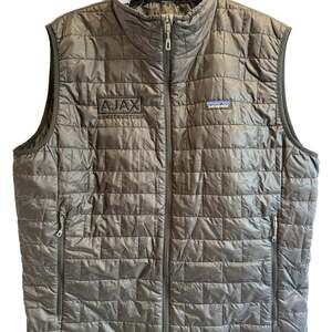 Patagonia Nano Puff Vest in black, size XL. This lightweight and windproof vest is brand new. Featuring the classic quilted design and Patagonia branding, it also includes an 'Ajax Construction' logo on the front. Perfect for layering in various conditions, offering warmth without bulk. Constructed with 100% recycled polyester shell and lining, with PrimaLoft P.U.R.E. insulation. New with tags.