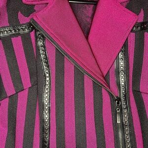 Studded jacket with asymmetric zipper and functional zip closure. Bold, edgy design.
