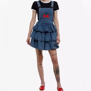 Rock some denim next time you're in the skies! This denim skirtall from Kiki's Delivery Service features a red bow and the movie title on the front bib, plus a patch of Jiji on the skirt edge. Comes with a big red bow on the back and three tiers of ruffles, plus adjustable straps.