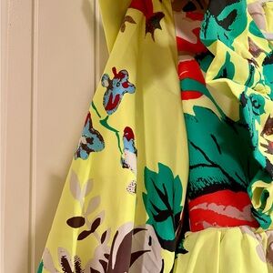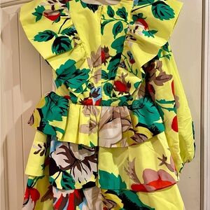 Vibrant floral dress with bold yellow, green and red hues. Eye-catching design by Christopher John Rogers. Asymmetrical sleeves, ruffle features, and above the knee length. Great condition.