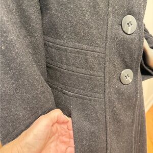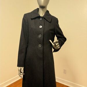 Classic charcoal wool coat with a classic design. Ideal for any occasion. 80% Wool. Size 10. See measurements in photos.