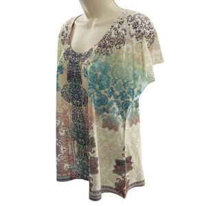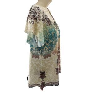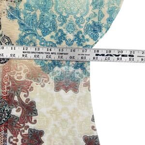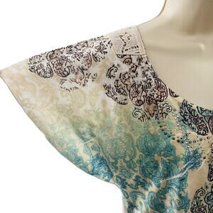 Features an ornate paisley and floral pattern in multicolored tones including teal, turquoise, cream, tan, burgundy, and black. Lightweight semi-sheer stretch fabric with unique flutter sleeves. Large lace crochet back panel, adding a boho vintage-inspired touch. Round scoop neckline embellished with subtle metallic studs for added bling detail. Perfect for Spring, Summer, Fall casual wear, festival outfits, or layering.