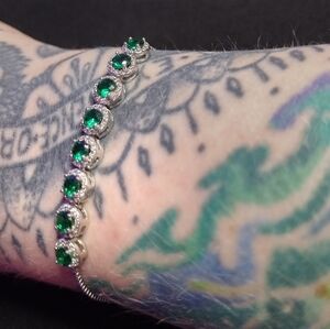 This stunning bracelet features vibrant green stones set in a sleek silver design. Adjustable, for all sizes. Perfect for adding a touch of elegance to any outfit. All questions welcome!