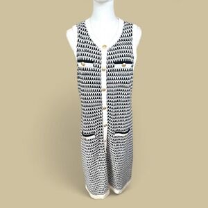 Embrace timeless elegance with this stunning Talbots knit dress, a piece that effortlessly blends sophisticated style with everyday comfort. The intricate geometric pattern in classic black and white creates a visually captivating texture, while the contrasting cream trim and elegant gold-toned buttons add a touch of refined polish. Designed with a flattering sleeveless silhouette and smart pocket details, this dress moves beautifully with you, offering both chic appeal and practical functionality. Perfect for a stylish brunch, a professional luncheon, or an evening out with friends, this versatile dress ensures you look polished and feel fabulous.