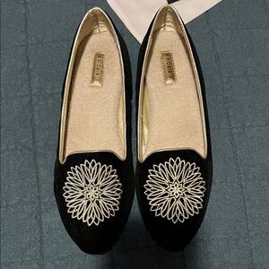 Chic black velvet flats with elegant gold embroidery. Comfortable and stylish for any occasion. Sherpa lined. Small spot on back of heel shown in picture.