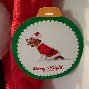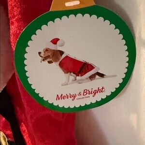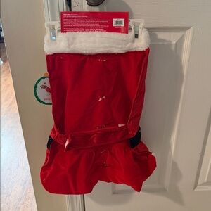 Festive red Mrs. Claus costume with a matching Santa hat. Perfect for holiday celebrations. For large size dog .