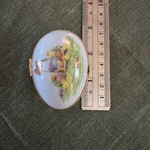 Vintage blue porcelain trinket box with Easter chicks and basket image. Gold trim and accents. A chick image printed inside.