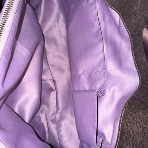 Interior is purple with 3 large inside compartments, one on each side and middle has zip closure