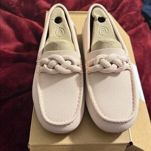 Cozy pink waffle knit sweatshirt. Relaxed fit with V-neck design. Ideal for casual wear.