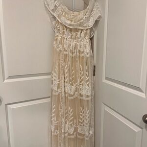 Beautiful Baltic Born maxi dress in a soft cream/nude tone with intricate white floral embroidery throughout. Features a romantic off-the-shoulder ruffle neckline, sheer lace overlay, and flowing maxi skirt. Fully lined for coverage while maintaining an airy, elegant look.