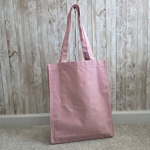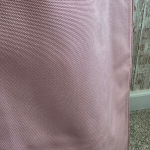 This is a Burberry tote bag, new without tags or box. The bag is light pink and made of a fabric polyester material.. The word "BURBERRY" is embossed on the front of the bag. There are no visible imperfections.