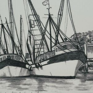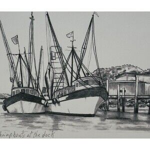 The artwork depicts shrimp boats moored at a dock, a classic maritime harbor scene with strong coastal and nautical appeal. The piece appears to be executed in ink and/or watercolor wash, with the artists signature in pencil. Fine line work and soft tonal shading give the drawing depth and movement.