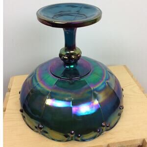 Indiana Glass LG Pedestal Bowl Carnival Glass Peacock Blue Garland Iridescent