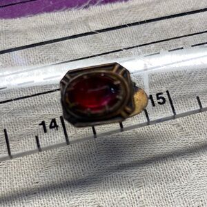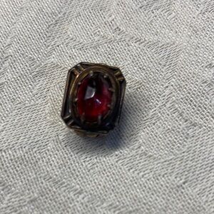 This is an antique collar clip. It needs polished the clip is spring activated has red stone. Do not know if there are any markings on it.