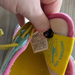 Fun and funky, 80's inspired color palette sneakers from Onitsuka Tiger! A lovely mix of yellow, pink, and teal. Perfect for a bold look and a statement sneaker. Suede heel cuffs for an extra ooph.