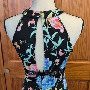 Chic black maxi dress with vibrant floral patterns. Features a stylish halter neckline. Ideal for various occasions. Lace/mesh accents