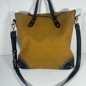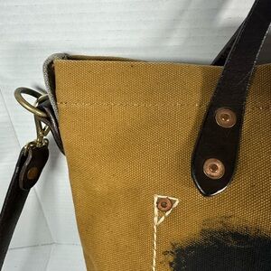 Extremely rare RRL (Double RL) Ralph Lauren canvas and leather bag. This is a premium sub-brand of Ralph Lauren. Made with a heavy-duty canvas body with full-grain leather straps, trim, and accents. The bag features a vintage-inspired design with exposed white stitching, brass rivets, and a zipper closure for added durability. It functions as both a tote and a shoulder/crossbody bag due to the presence of both top handles and a long, adjustable strap. The "Double RL" name comes from the personal ranch in Colorado owned by Ralph and his wife, Ricky Lauren. The line is a passion project inspired by the rugged spirit of the American West, vintage workwear, military uniforms, and the timeless style of ranch life. RRL products focus on authenticity and heritage, often using high-quality materials and handcrafted leather with meticulous attention to detail.