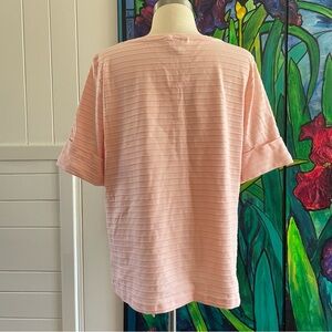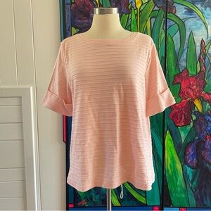 Chic light pink top with horizontal ribbed texture. Short sleeves, relaxed fit, heavy weight. Ideal for casual or business wear. In excellent to like new condition, worn once (see photos). Perfect for styling up or down, wearing as is or layering, this cute top is a must-have!