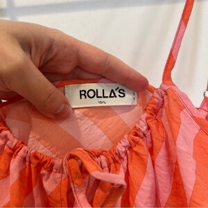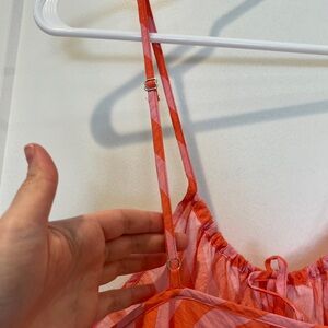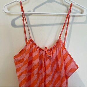Chic dress with diagonal orange and pink stripes. Ideal for summer outings.