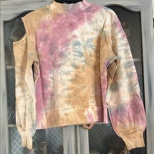 Cozy tie-dye sweatshirt with a blend of pink, tan, and cream. Features a unique shoulder cut-out. Ideal for casual wear.