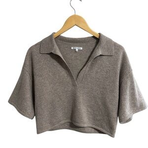 The Maye by Reformation is a short sleeve, polo sweater with a collared neckline, bottom rib trim, and boxy silhouette