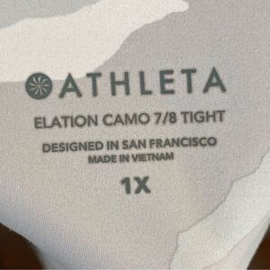 ATHLETA Elation Camo 7/8 Tight Sz 1X Yoga Workout #563650 Taupe Grey Workout Condition: Excellent preowned, no rips tears or stains product details FEEL: Fabric is soft to the touch with gentle support FOR: Yoga, studio, or floor practice FAVE: Drop in back pocket for accentuation #563650 fabric + care Polyester/Lycra WICKING. Pulls sweat away from the body to the surface of the fabric so it can evaporate faster BREATHABLE. Sweat can easily move through the fabric, helping it evaporate Machine wash and dry. Imported. fit + sizing Fitted next to the body with an ultra high-rise waistband Approx Measurements lying flat Waist 17 Rise 12 Inseam 23 P8583