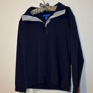 Navy top with a stylish striped collar. Features button details.
